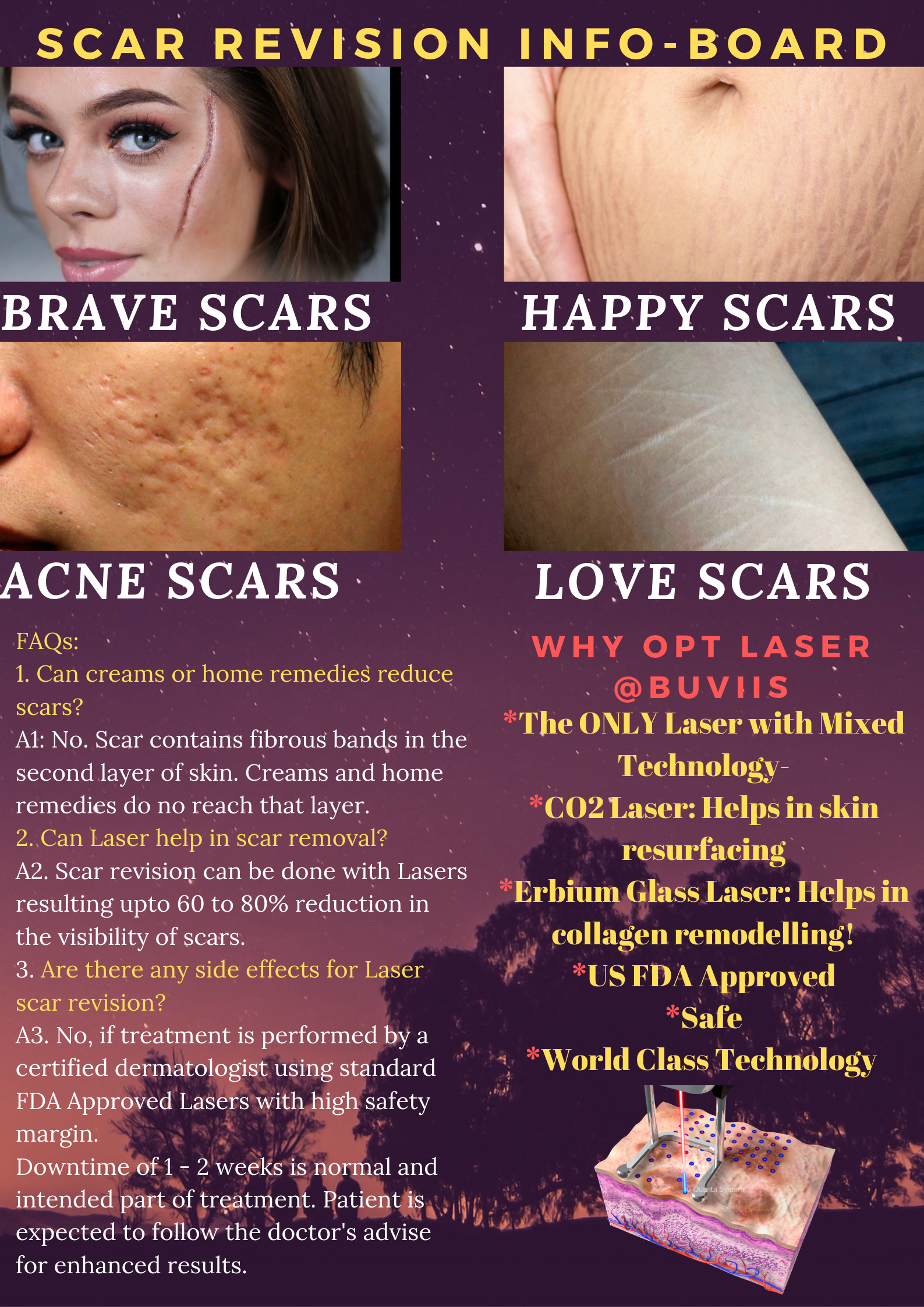 Note: Do not get fooled by online creams or over the counter creams for scar removal. Since the fibrotic threads responsible for scar formation are in the second layer of the skin, energy devices like LASERS alone have the ability to reach them make the scar look less obvious.